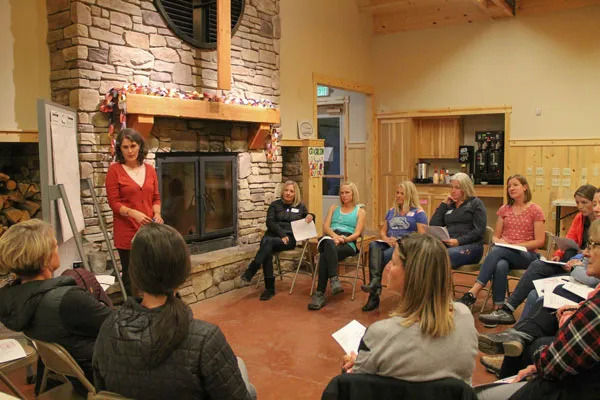 Sawtooth Lodge featuring our dining hall, indoor fireplace, large deck, bathrooms, and a full sound system including microphone and projector